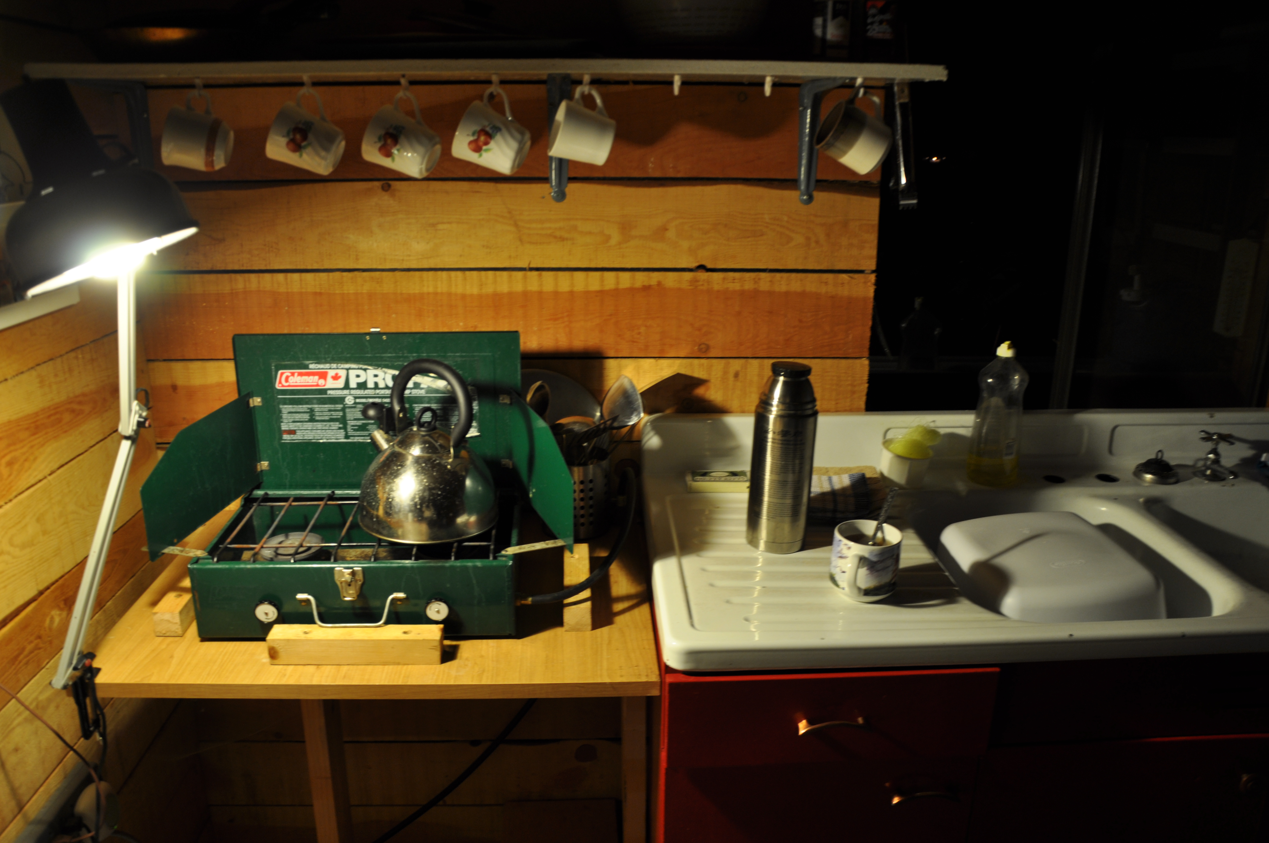 A faint glow guided us towards the quaint wooden building. Inside, the Camping Cabin was toasty and warm. A fire was burning in the wood stove, heating up the inner area. There was a bed, a couple sitting chairs, a large kitchen sink, a gas stove and a lamp. Rustic pots and pans, mismatched mugs and cooking utensils were stacked on shelves above the sink. Directly outside the heated area was a covered porch, equipped with a small dining table, chairs, an egg swing, a make-shift sofa and one last lamp.