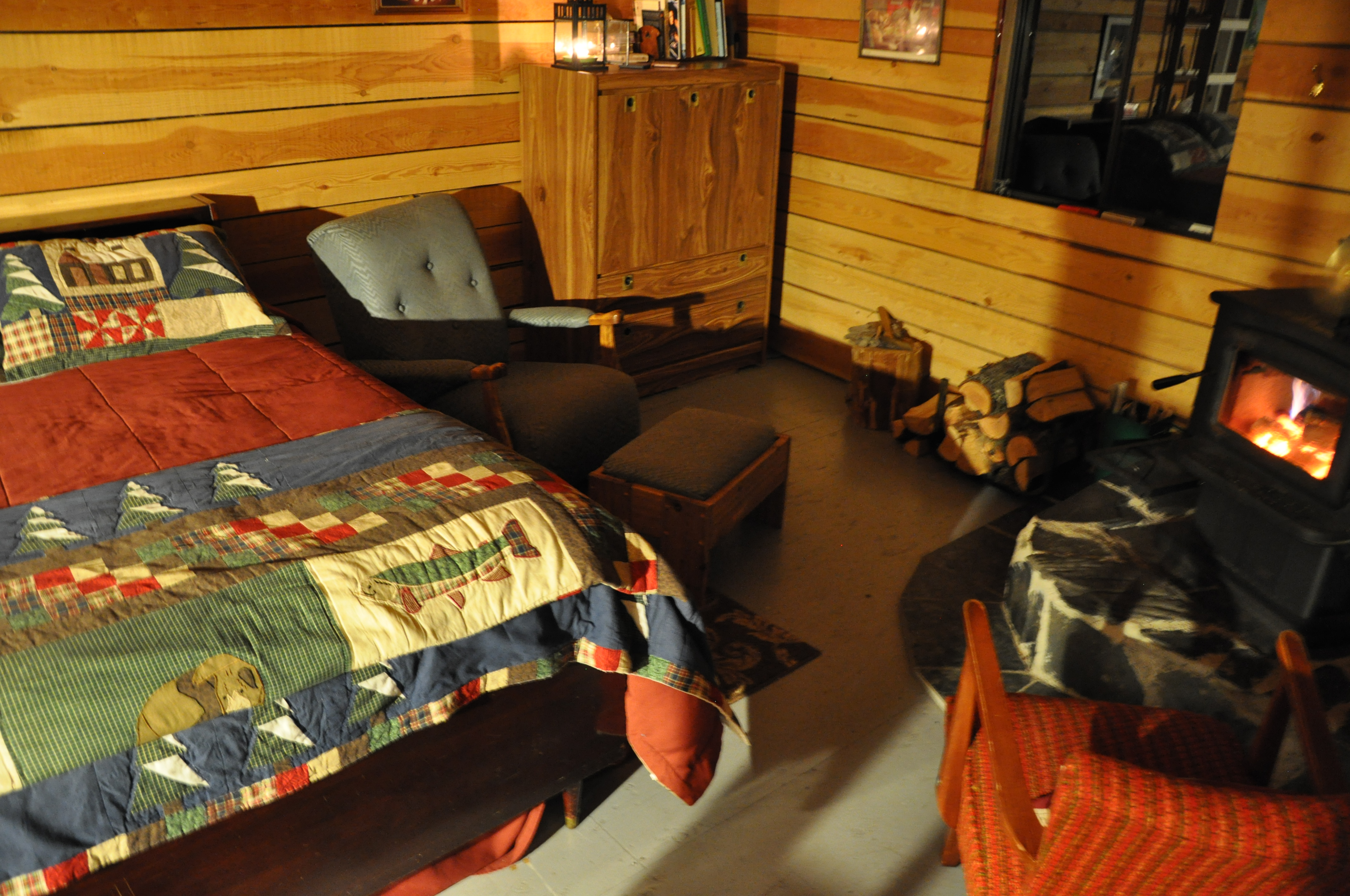 Candles flickered as we put our bags down. I smelled pine and smoke.