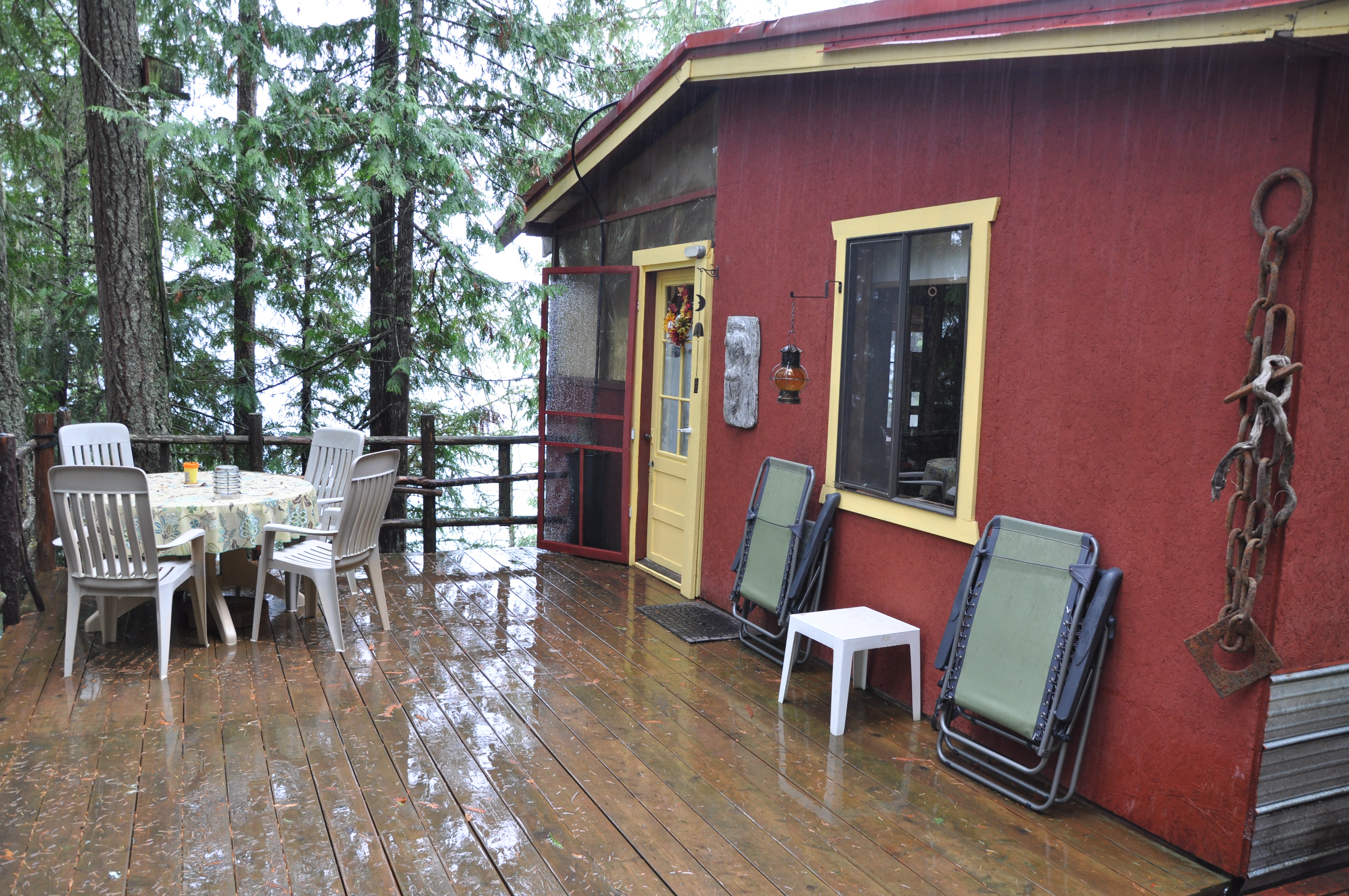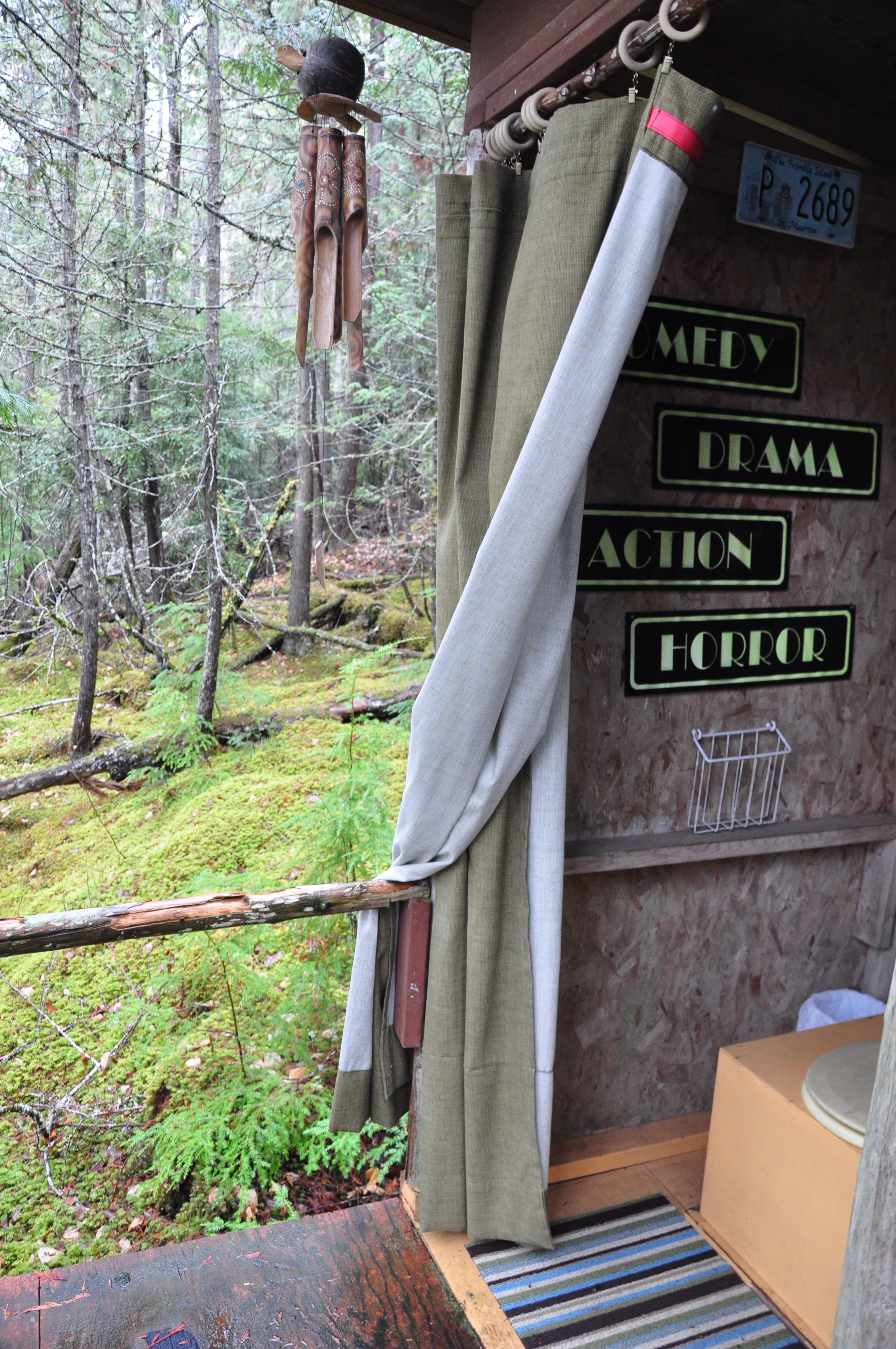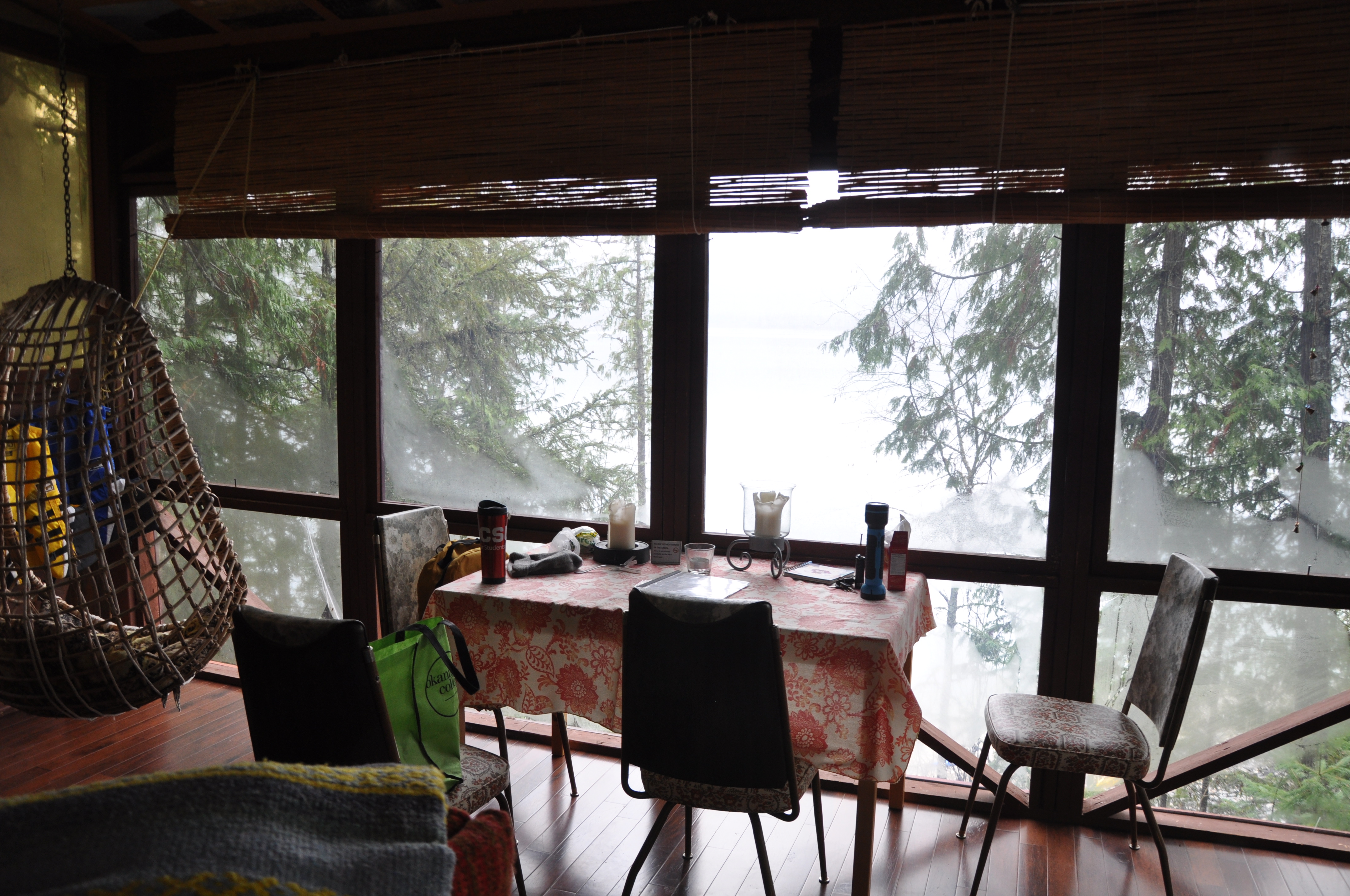 We woke up to more rain. It took us awhile to get a fire going. There’s a composting toilet (which looks like a normal toilet, in my opinion) inside the cabin, but it’s requested for guests to use the outside one. Running out to the nearby outhouse wasn’t difficult—it’s about ten steps away—but putting on our layers to brave the cold was slightly unenjoyable. Still, I have to admit it was one of the coolest outhouses I have ever used (did I just say “cool” and “outhouse” in the same sentence?). The only door is a heavy curtain which, to be honest, I never closed. It’s pretty sweet staring out into the forest as you pee.