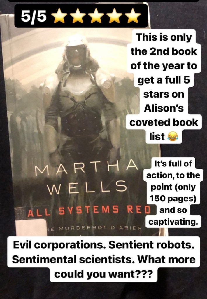 I never thought I’d be so entertained by the voice of a robot. Murderbot, as it calls itself, is somehow a loveable, although dangerous, protagonist. This book is funny, relatable and starts off unconventionally with this sentence: “I could have become a mass murderer after I hacked my governor module, but then I realized I could access the combined feed of entertainment channels carried on the company satellites.” Who wouldn’t choose mind-numbing TV over the effort of slaughter? I enjoyed the second installment and will finish the series soon.