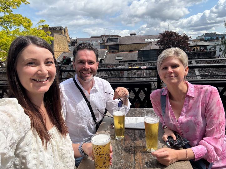 After I buy some English Country Garden Tea (lavender and chamomile), we sit in the sun upstairs at Camden Town Brewery for a pint. I sip a Campfire Hazy IPA while Adam and Elisa enjoy lagers.